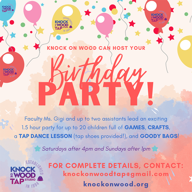 For a novel birthday party experience, our own Gigi Buscaglio and up to two assistants will lead an exciting 1.5 hour party for up to 20 children full of games, crafts, a tap dance lesson (tap shoes provided!) and goody bags!